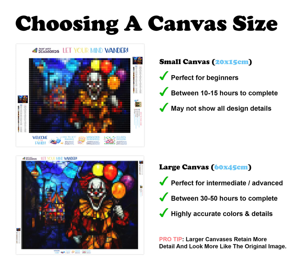 Escape into a world of vibrant colors and creative tranquility with the ‘The Creepiest Clown’ Diamond Painting Kit. This exclusive full-drill design by artist Caleb Smith is available only at Paint With Diamonds. Let your mind unwind as you piece together shimmering diamonds to create a beautiful masterpiece.