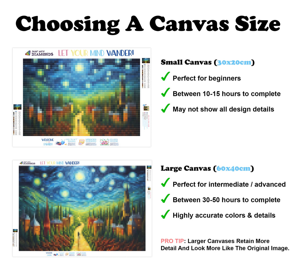 Large canvases show tiny details and all lettering, but may take up to 50+ hours to complete.
