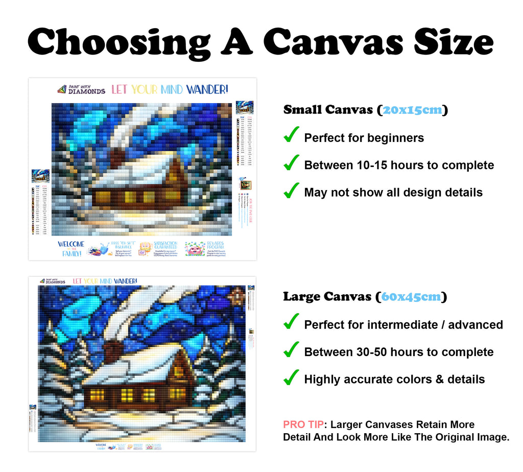 Large canvases show tiny details and all lettering, but may take up to 50+ hours to complete.