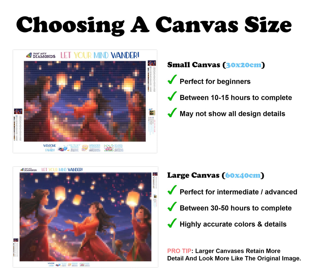 Large canvases show tiny details and all lettering, but may take up to 50+ hours to complete.