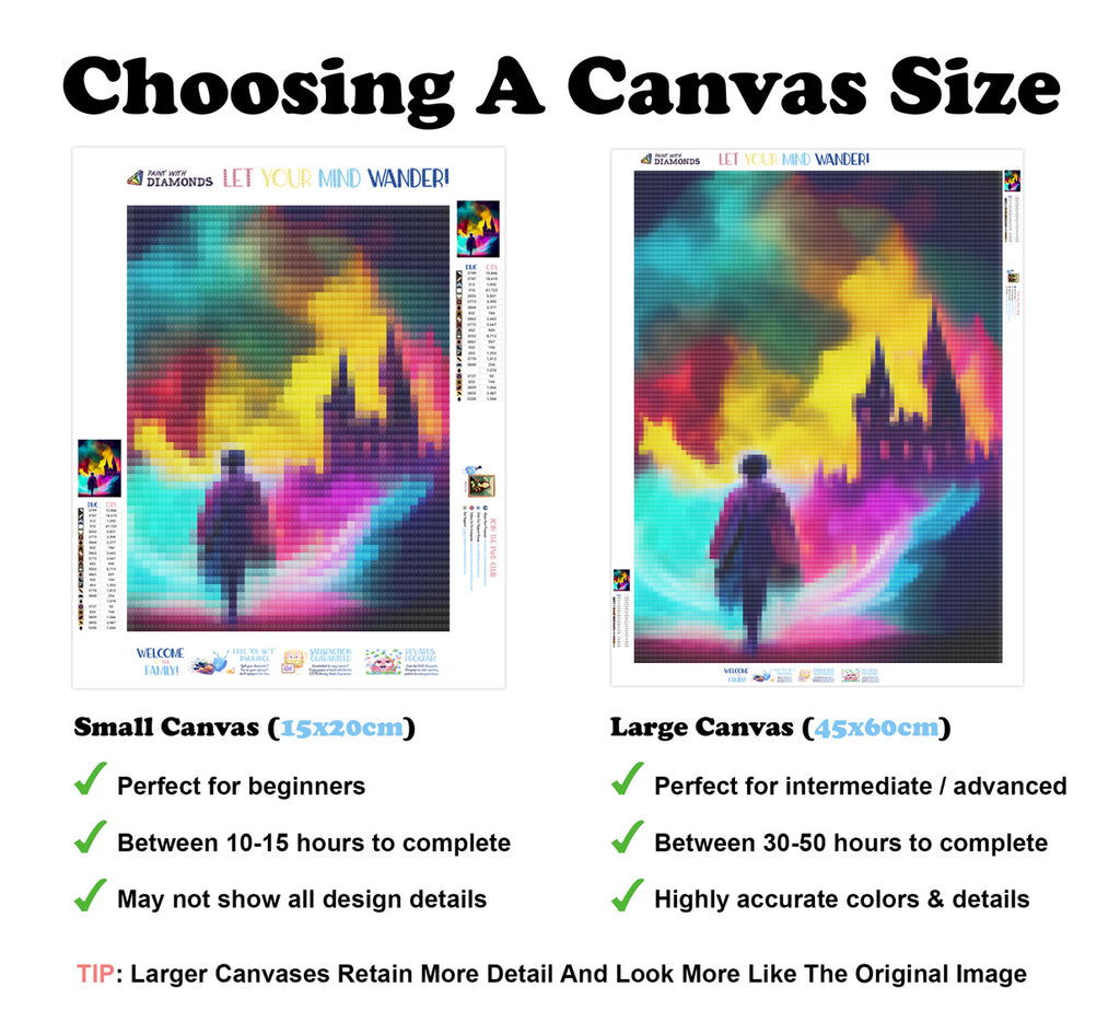 Large canvases show tiny details and all lettering, but may take up to 50+ hours to complete.