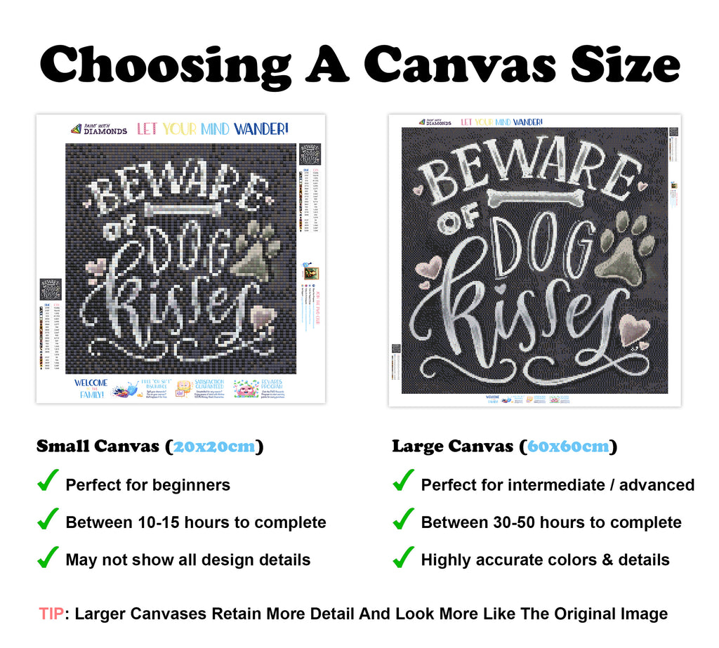 Relax, unwind, and create Diamond Art! "Beware Of Dog Kisses" by artist The White Lime is now available exclusively at Paint With Diamonds® as a full-drill Diamond Painting Kit in your choice of Round or Square diamonds.