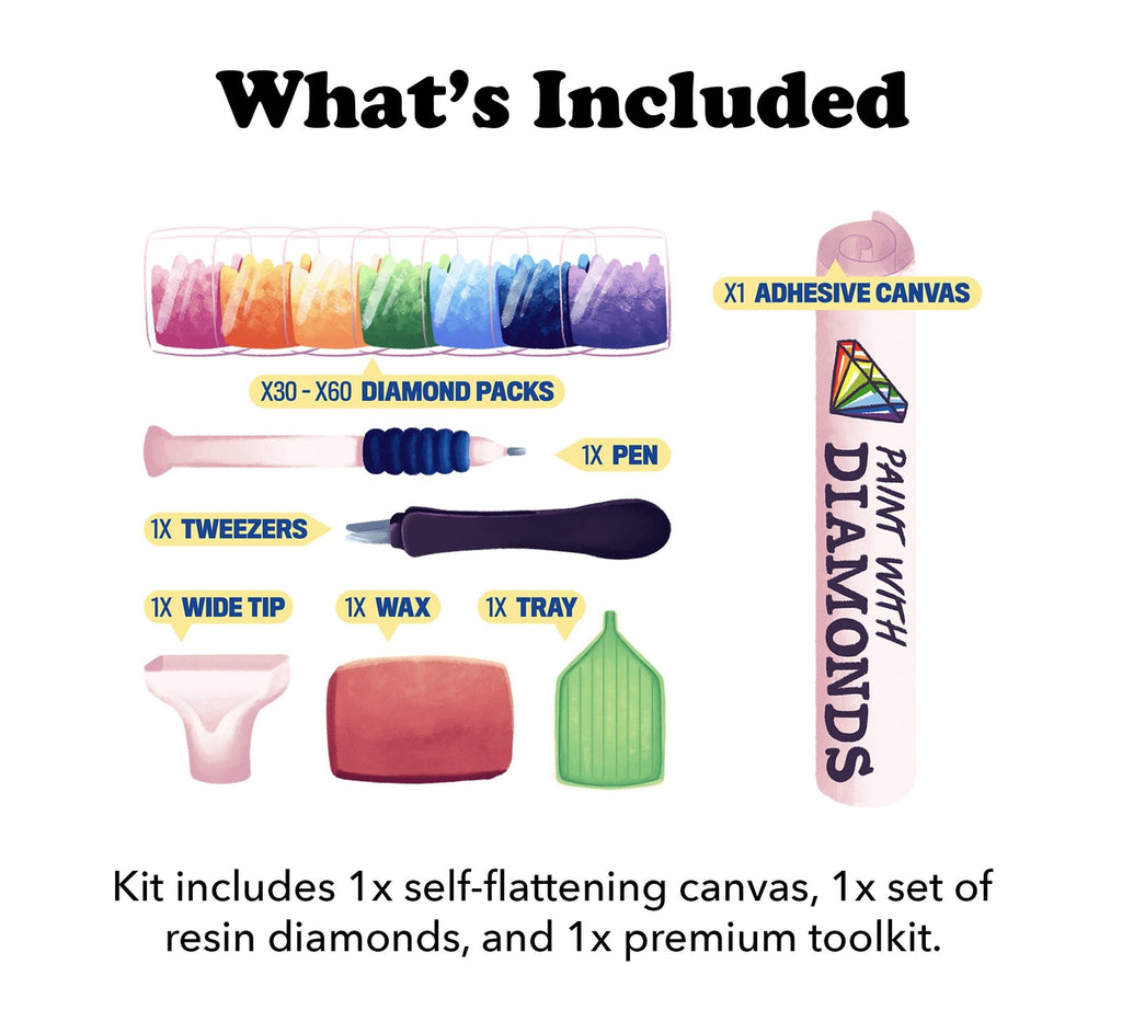 PREMIUM DIAMOND PAINTING KIT: Official Diamond Art kit includes 1x stay-flat adhesive canvas, 1x set of shimmering eco-friendly resin diamonds, and 1x premium toolkit. Diamonds cover the whole canvas.
