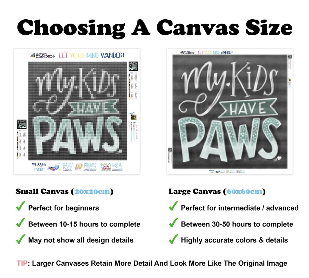 Relax, unwind, and create Diamond Art! "My Kids Have Paws" by artist The White Lime is now available exclusively at Paint With Diamonds® as a full-drill Diamond Painting Kit in your choice of Round or Square diamonds.