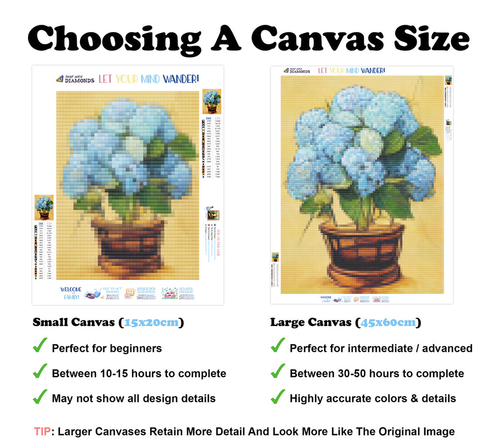 Large canvases show tiny details and all lettering, but may take up to 50+ hours to complete.