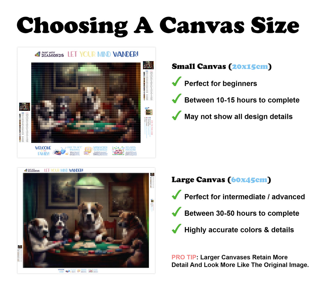 Large canvases show tiny details and all lettering, but may take up to 50+ hours to complete.