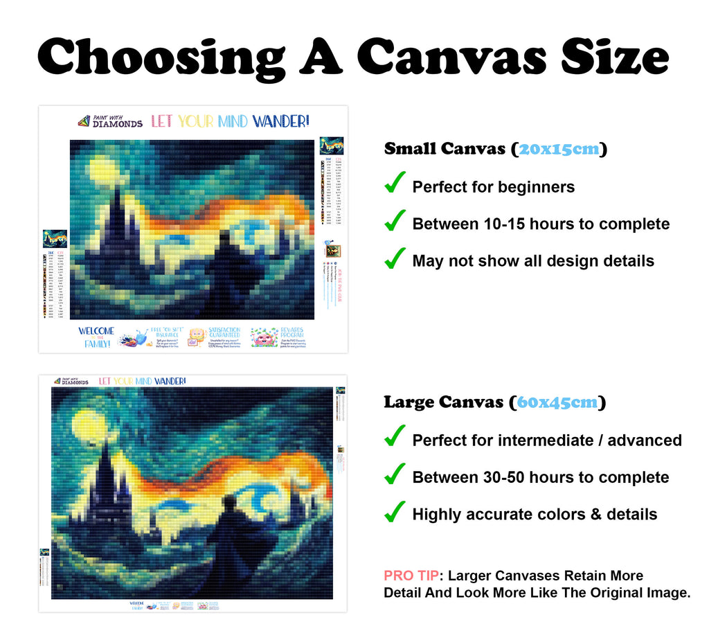 Large canvases show tiny details and all lettering, but may take up to 50+ hours to complete.