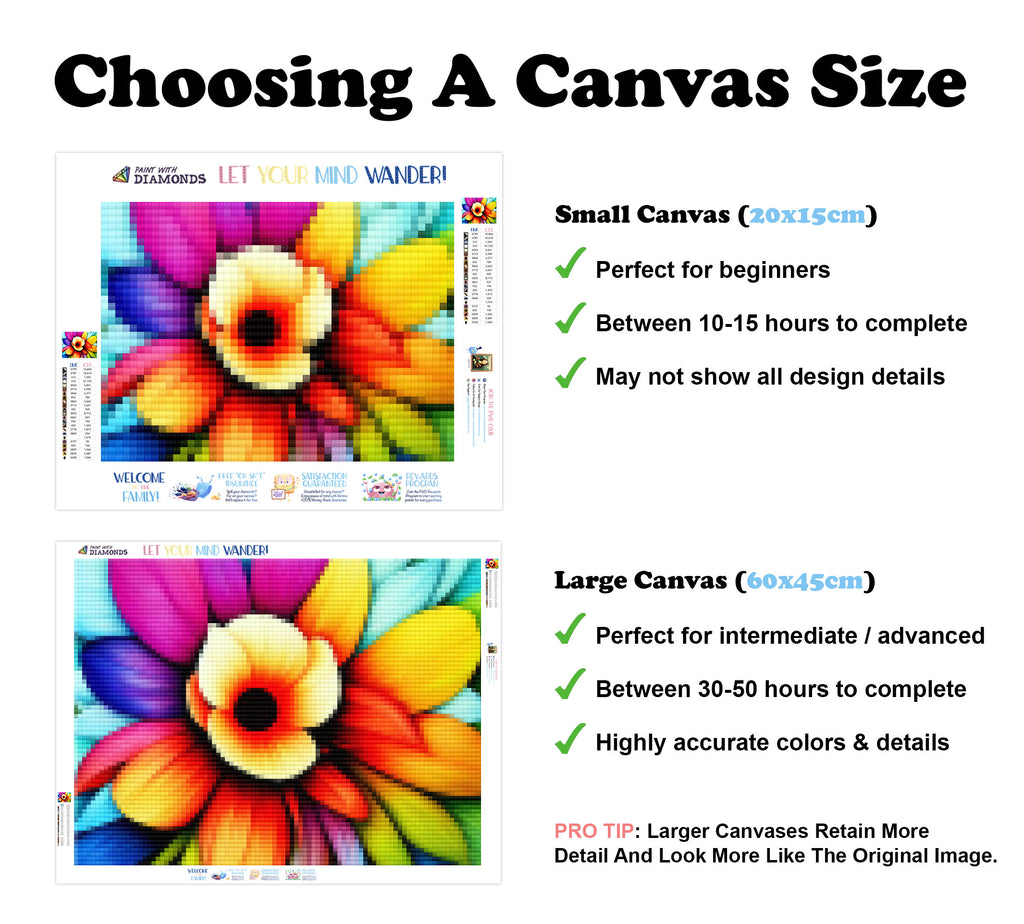 Large canvases show tiny details and all lettering, but may take up to 50+ hours to complete.