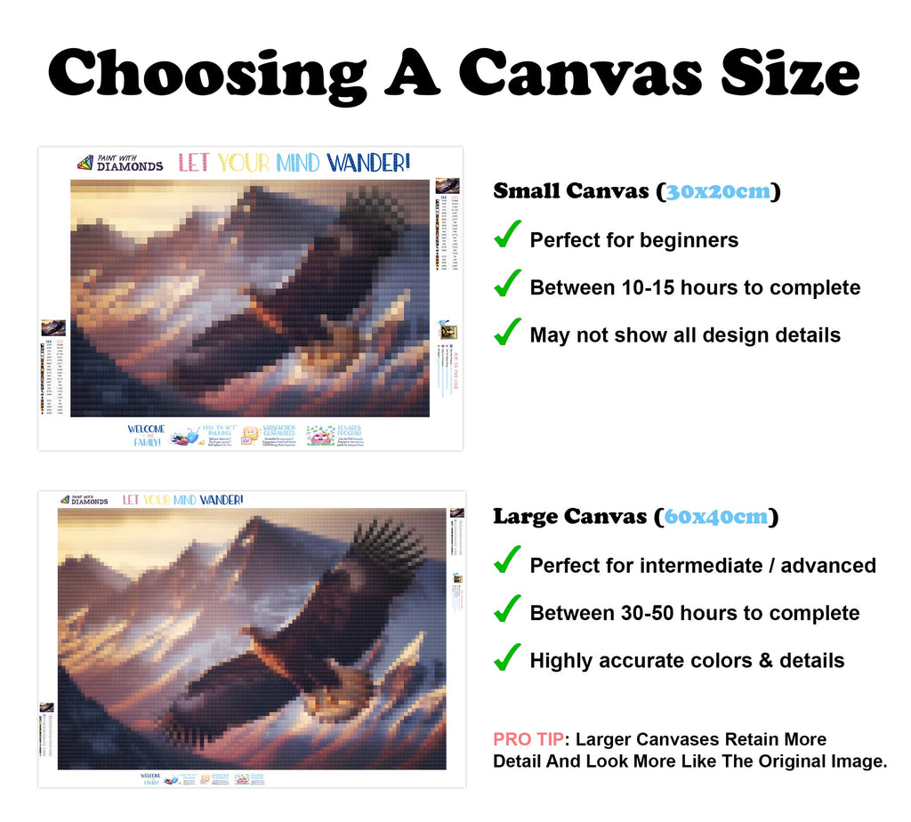 Large canvases show tiny details and all lettering, but may take up to 50+ hours to complete.