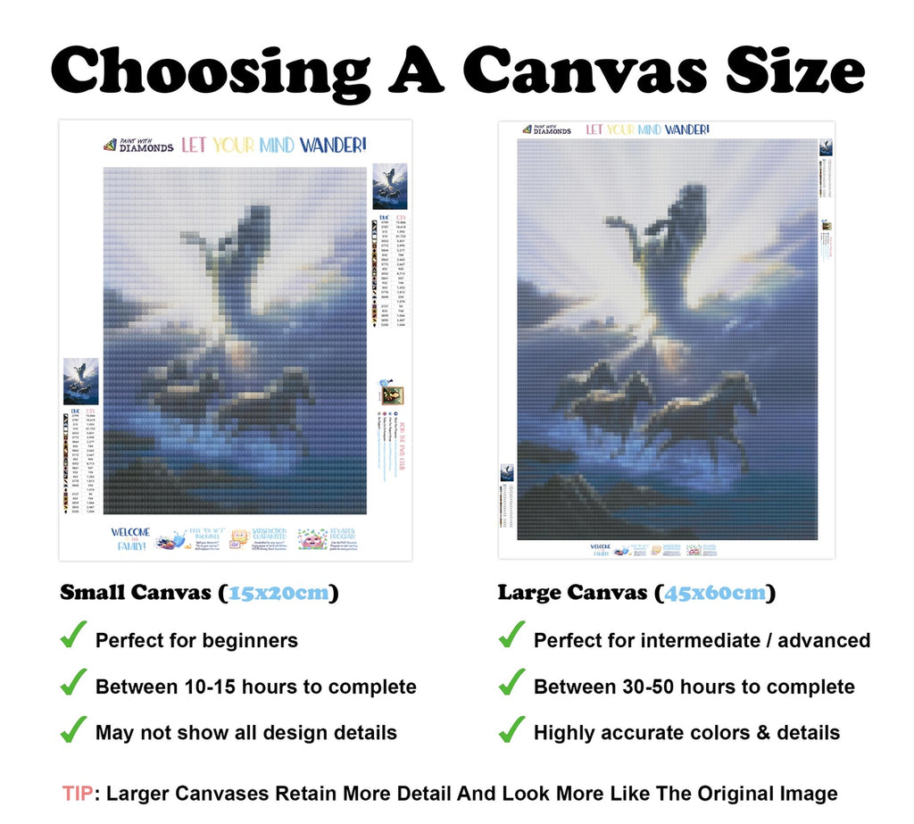 Large canvases show tiny details and all lettering, but may take up to 50+ hours to complete.Medium canvases show significant detail but take between 20-30 hours to complete.