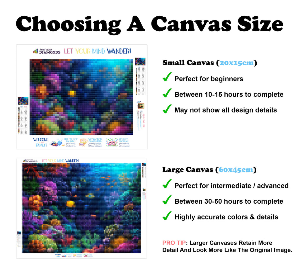 Large canvases show tiny details and all lettering, but may take up to 50+ hours to complete.
