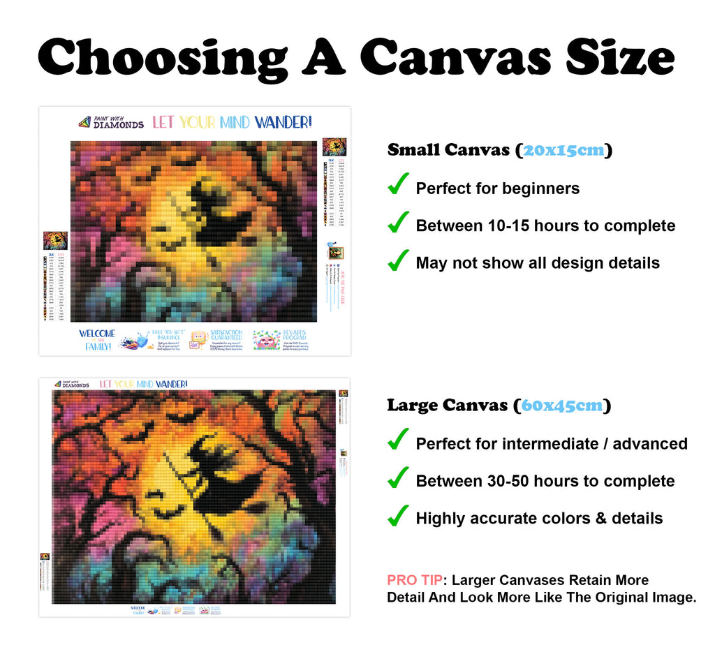 Large canvases show tiny details and all lettering, but may take up to 50+ hours to complete.
