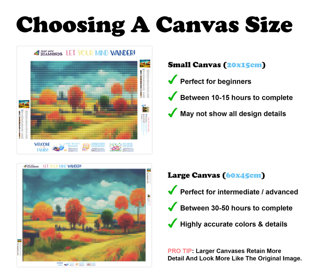 Large canvases show tiny details and all lettering, but may take up to 50+ hours to complete.