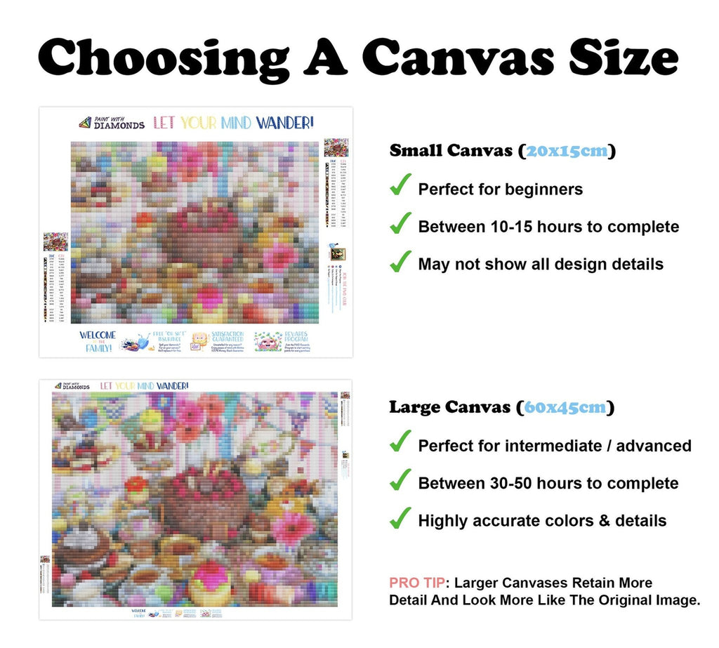 Large canvases show tiny details and all lettering, but may take up to 50+ hours to complete.