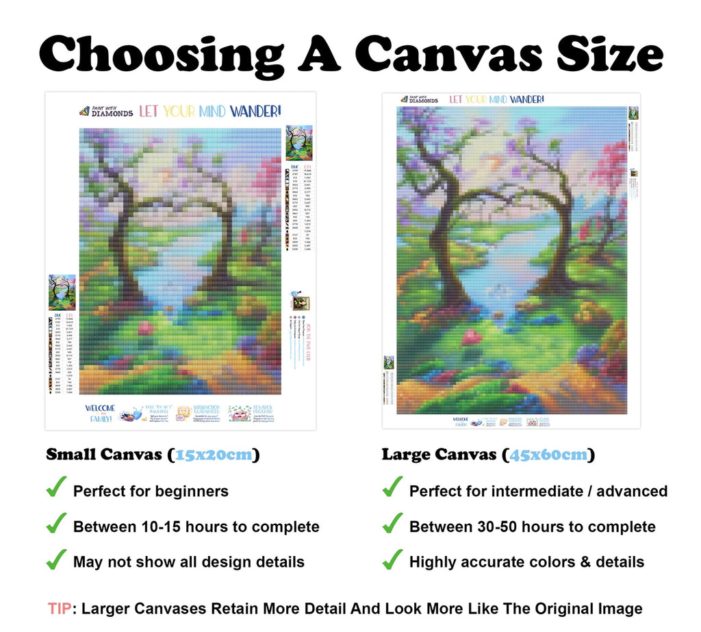 Large canvases show tiny details and all lettering, but may take up to 50+ hours to complete.Medium canvases show significant detail but take between 20-30 hours to complete.