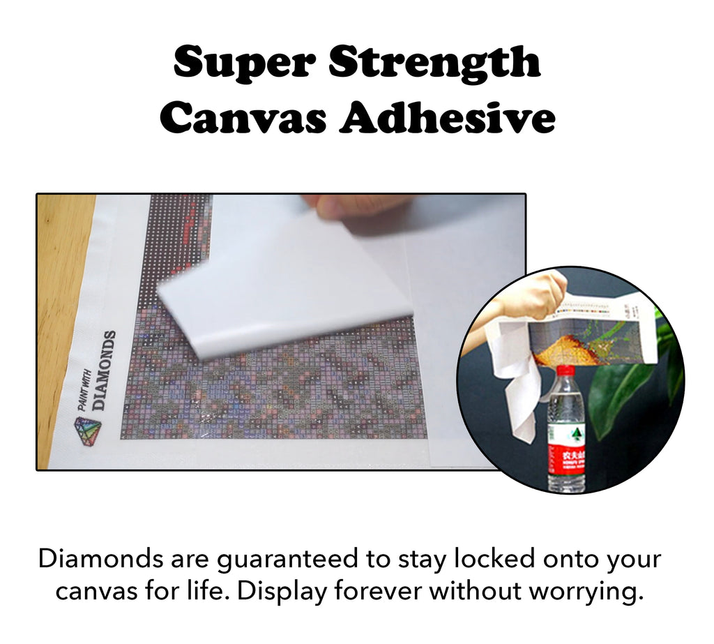 POURED-GLUE CANVAS ADHESIVE: Each kit features a proprietary hand-poured canvas adhesive guaranteed to keep your diamonds locked in for life. Each velvety-soft canvas has a transparent cover so you can see the entire pattern while you work.