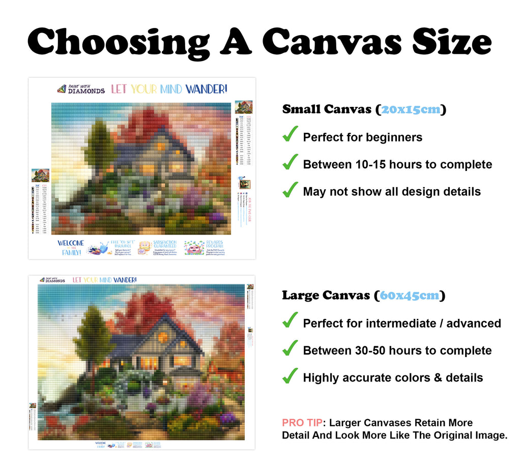 Large canvases show tiny details and all lettering, but may take up to 50+ hours to complete.