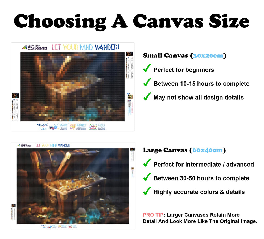 Large canvases show tiny details and all lettering, but may take up to 50+ hours to complete.