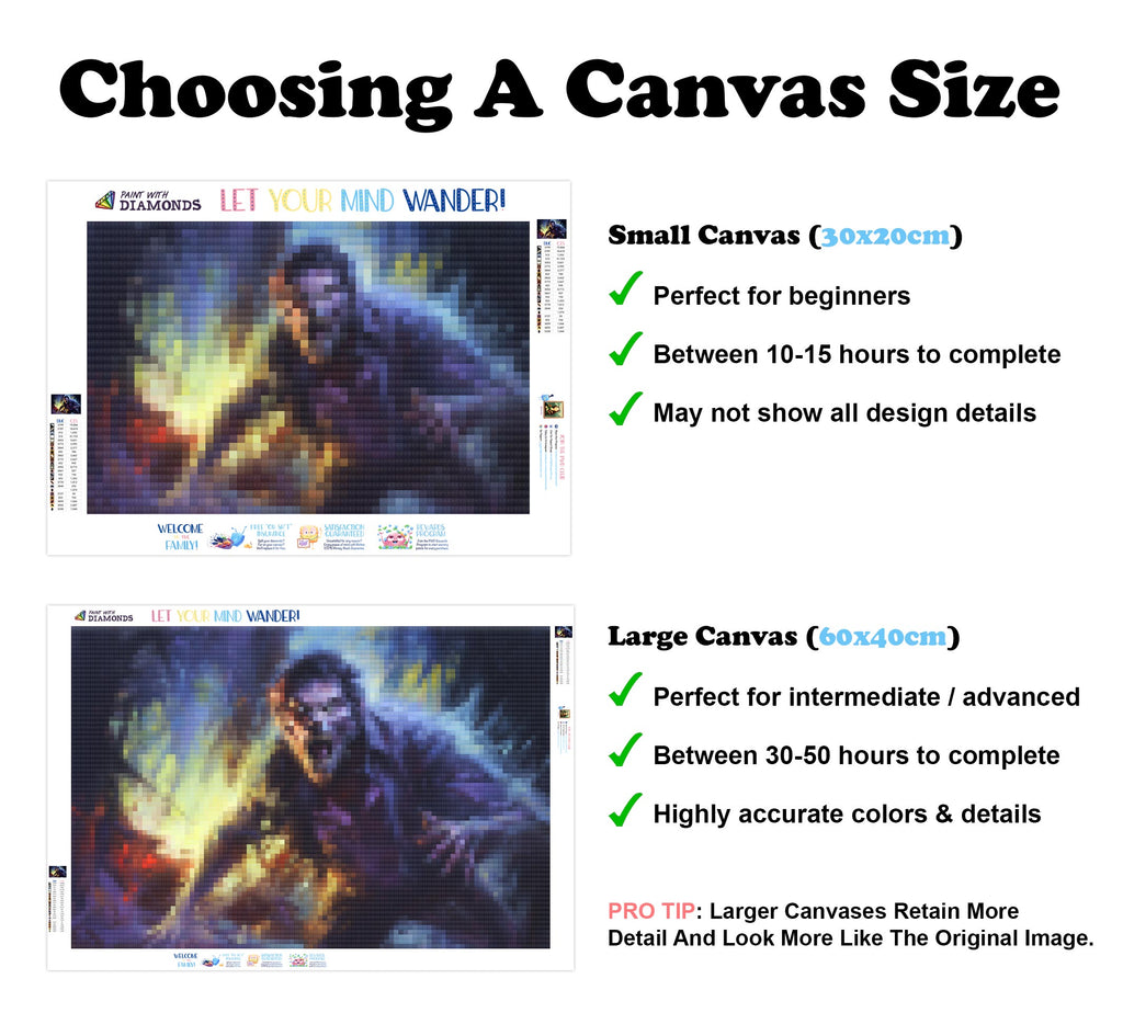 Large canvases show tiny details and all lettering, but may take up to 50+ hours to complete.