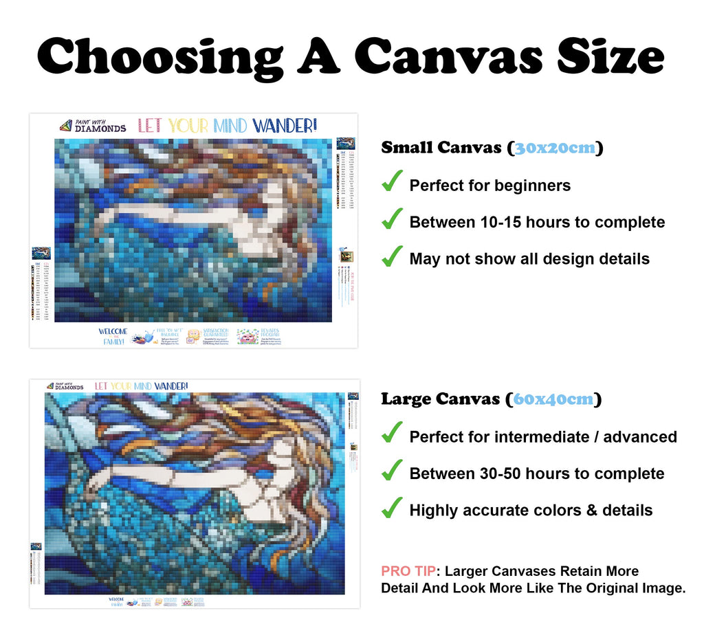 Large canvases show tiny details and all lettering, but may take up to 50+ hours to complete.