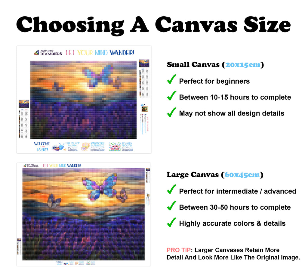 Large canvases show tiny details and all lettering, but may take up to 50+ hours to complete.