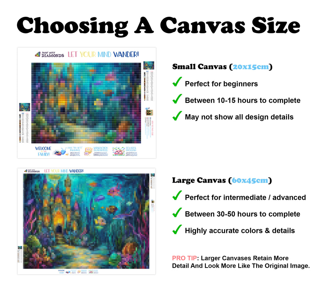 Large canvases show tiny details and all lettering, but may take up to 50+ hours to complete.