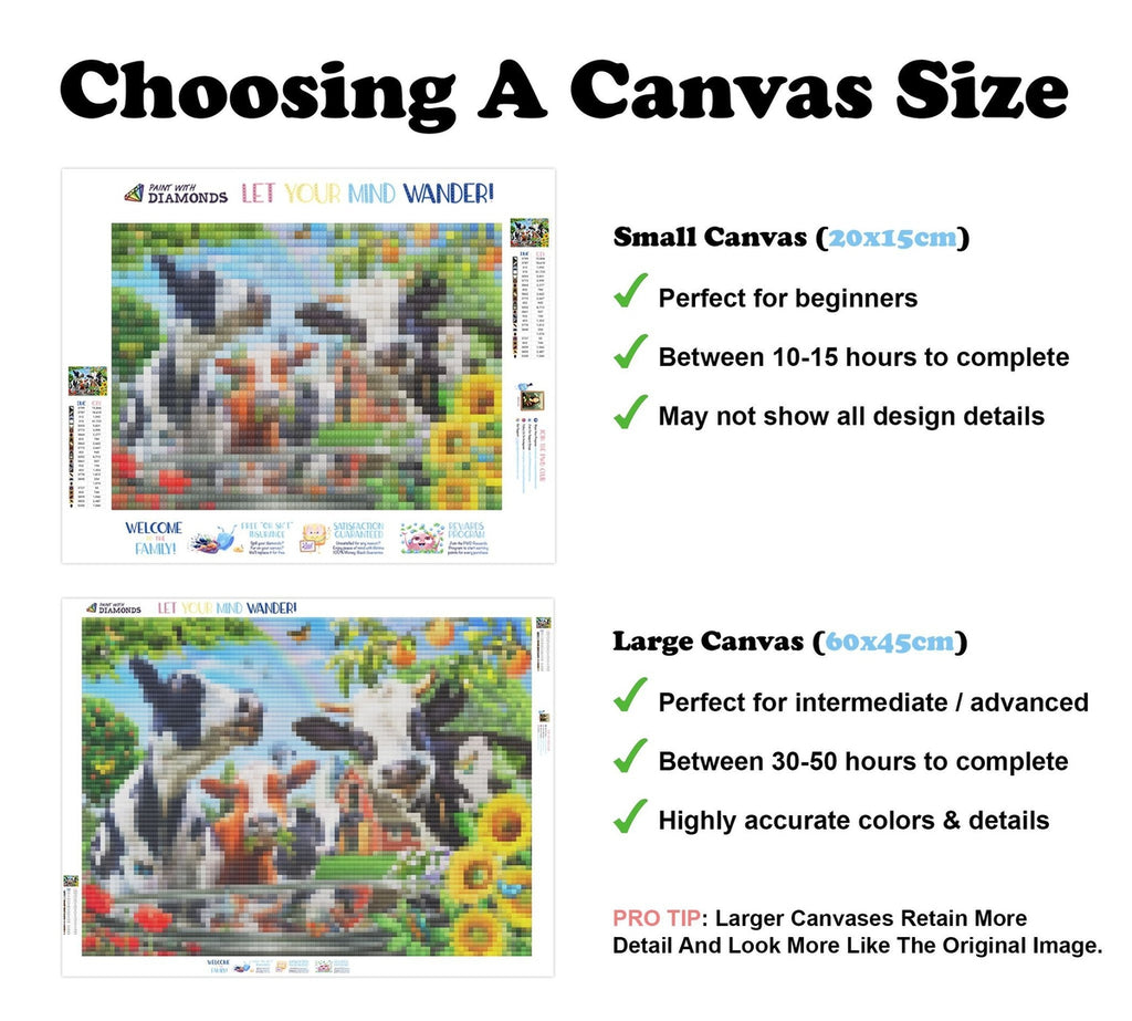 Large canvases show tiny details and all lettering, but may take up to 50+ hours to complete.