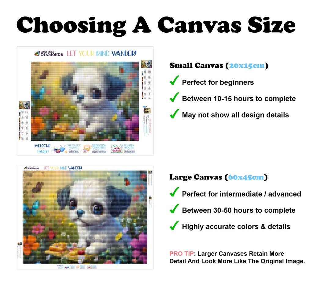 Dog walk on your canvas? Kids turn your diamonds into confetti? We'll replace your kit for free. Never cry over spilled diamonds.