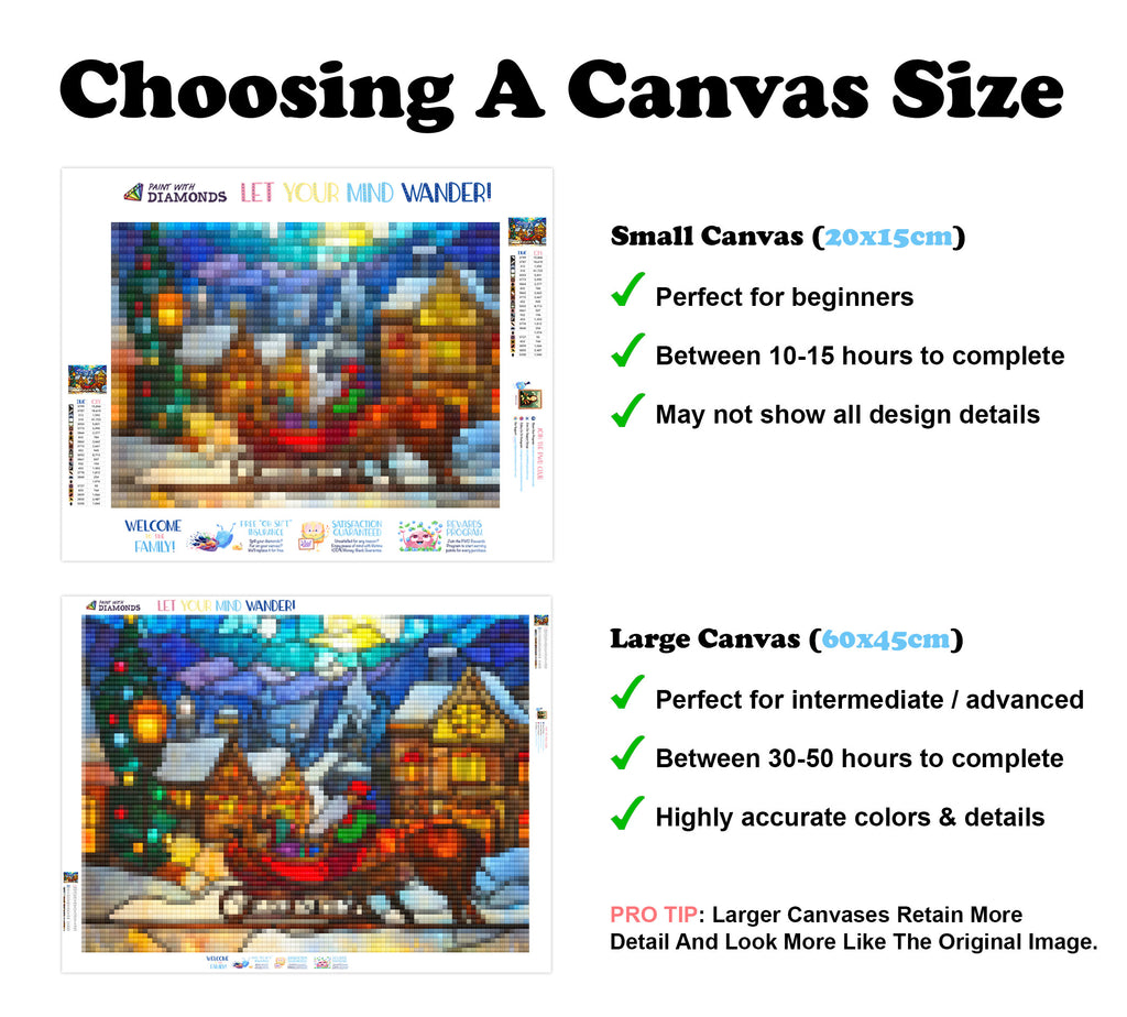 Large canvases show tiny details and all lettering, but may take up to 50+ hours to complete.
