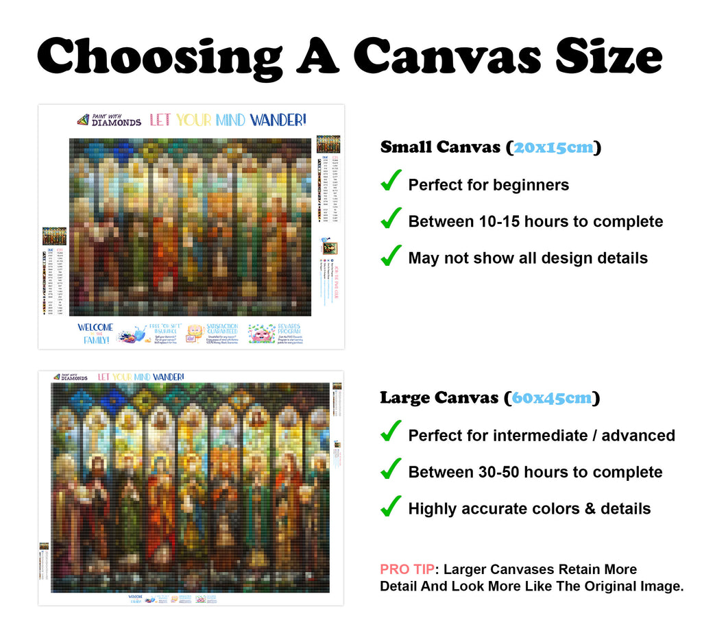 Large canvases show tiny details and all lettering, but may take up to 50+ hours to complete.