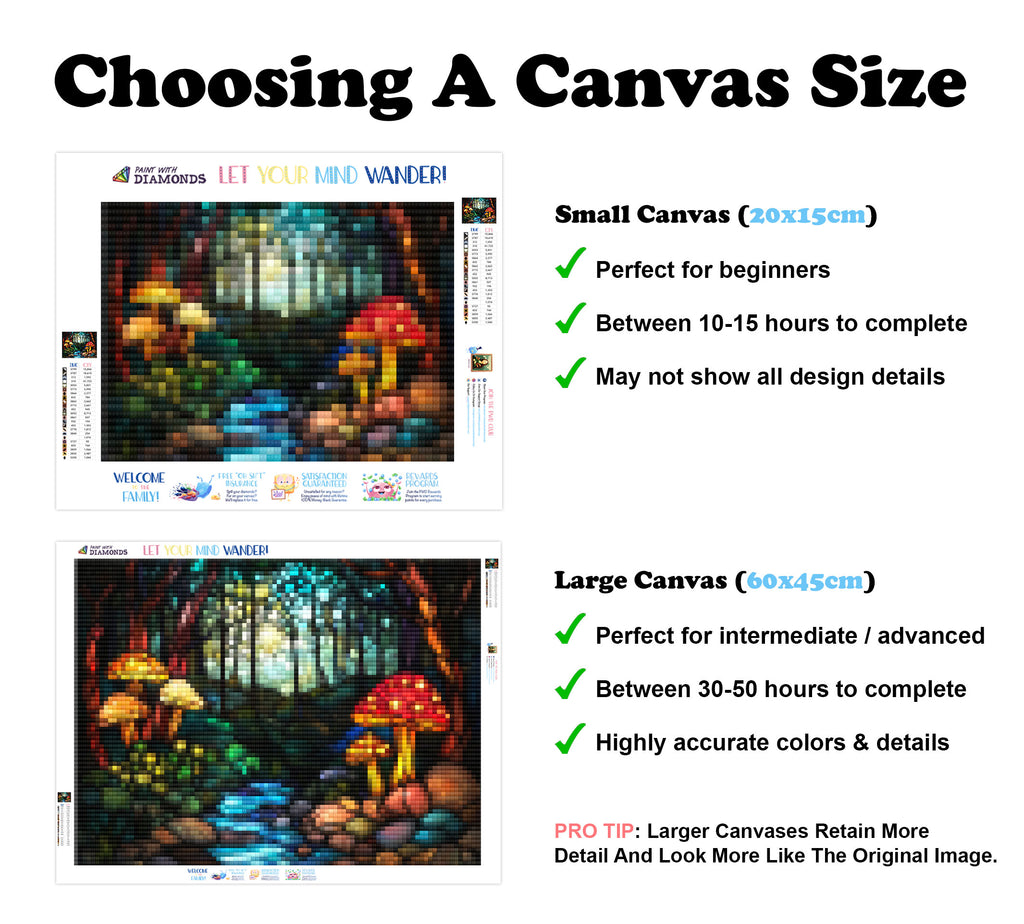 Escape into a world of vibrant colors and creative tranquility with the ‘Mystic Forest Mushrooms’ Diamond Painting Kit. This exclusive full-drill design by artist Caleb Smith is available only at Paint With Diamonds. Let your mind unwind as you piece together shimmering diamonds to create a beautiful masterpiece.