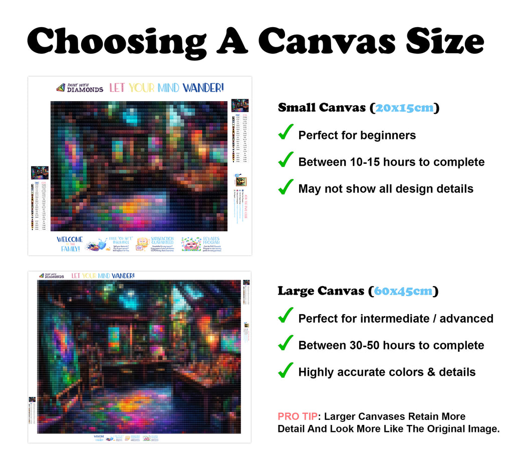 Large canvases show tiny details and all lettering, but may take up to 50+ hours to complete.
