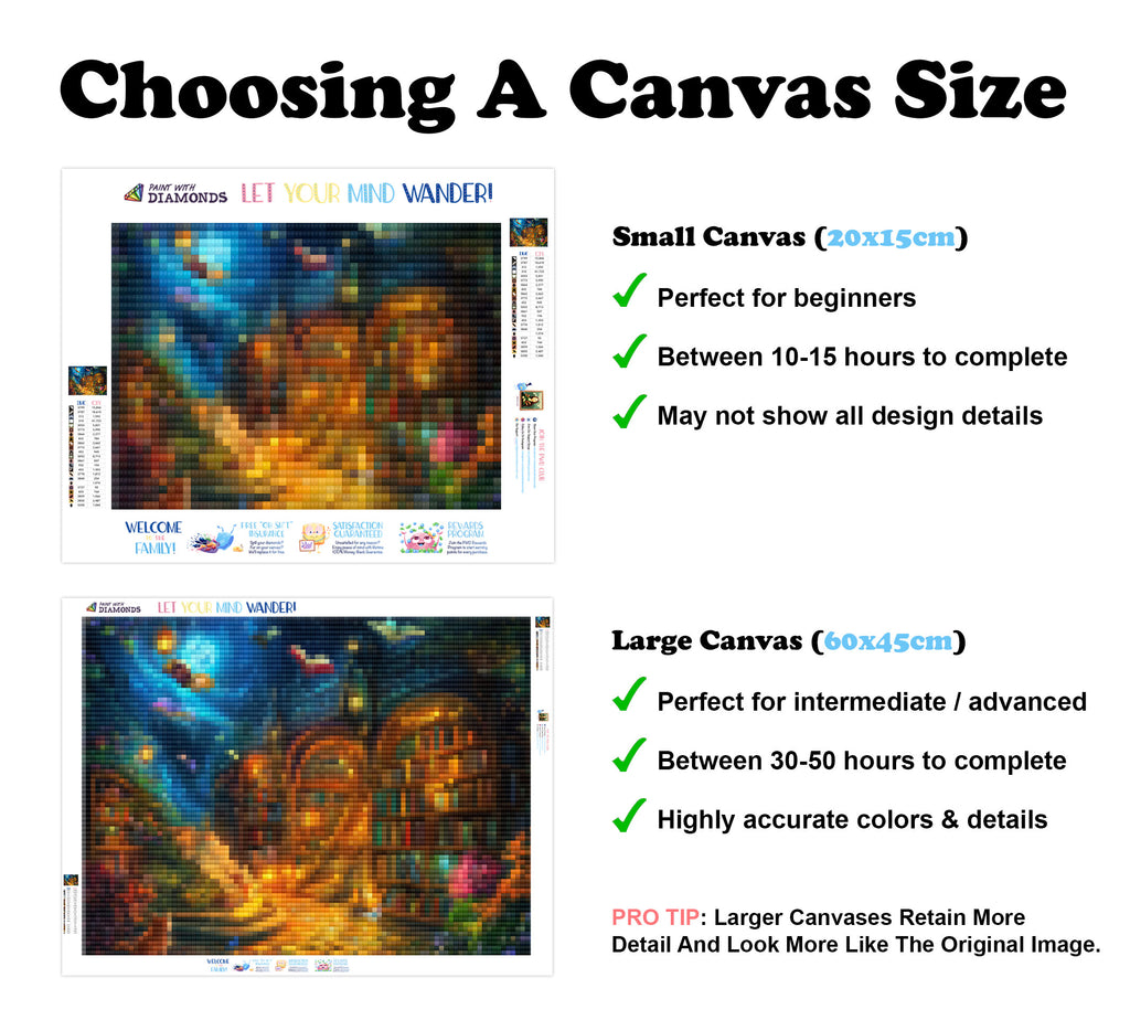 Large canvases show tiny details and all lettering, but may take up to 50+ hours to complete.