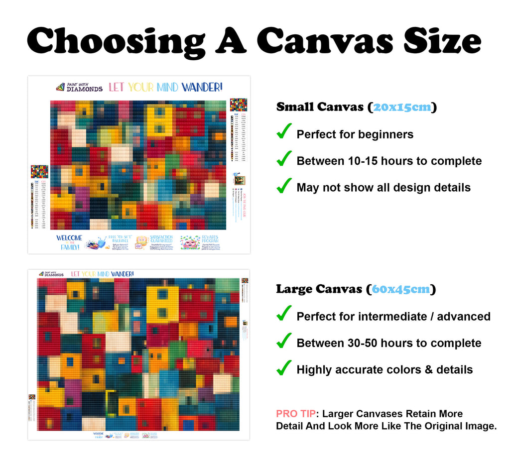 Large canvases show tiny details and all lettering, but may take up to 50+ hours to complete.