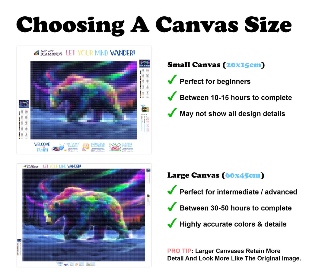 Large canvases show tiny details and all lettering, but may take up to 50+ hours to complete.
