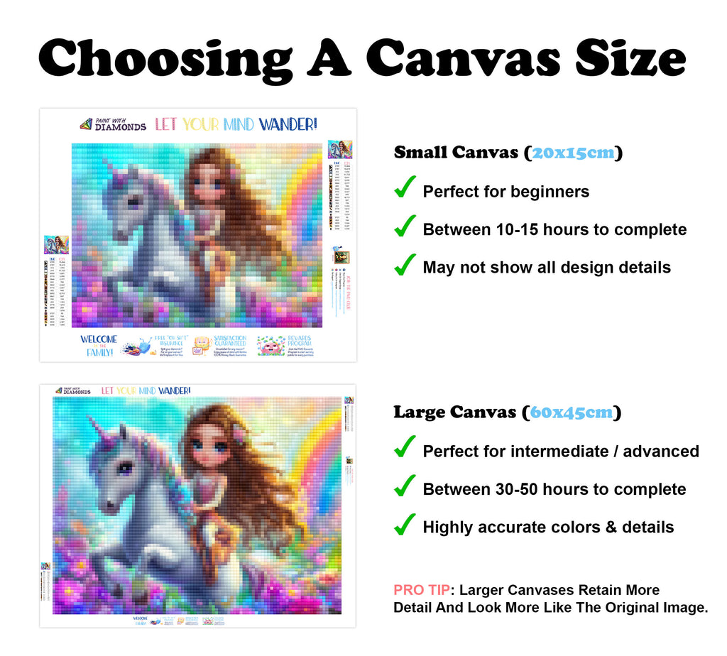 Large canvases show tiny details and all lettering, but may take up to 50+ hours to complete.