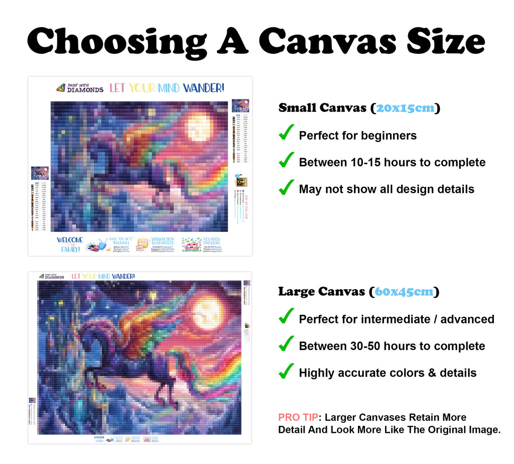 Large canvases show tiny details and all lettering, but may take up to 50+ hours to complete.