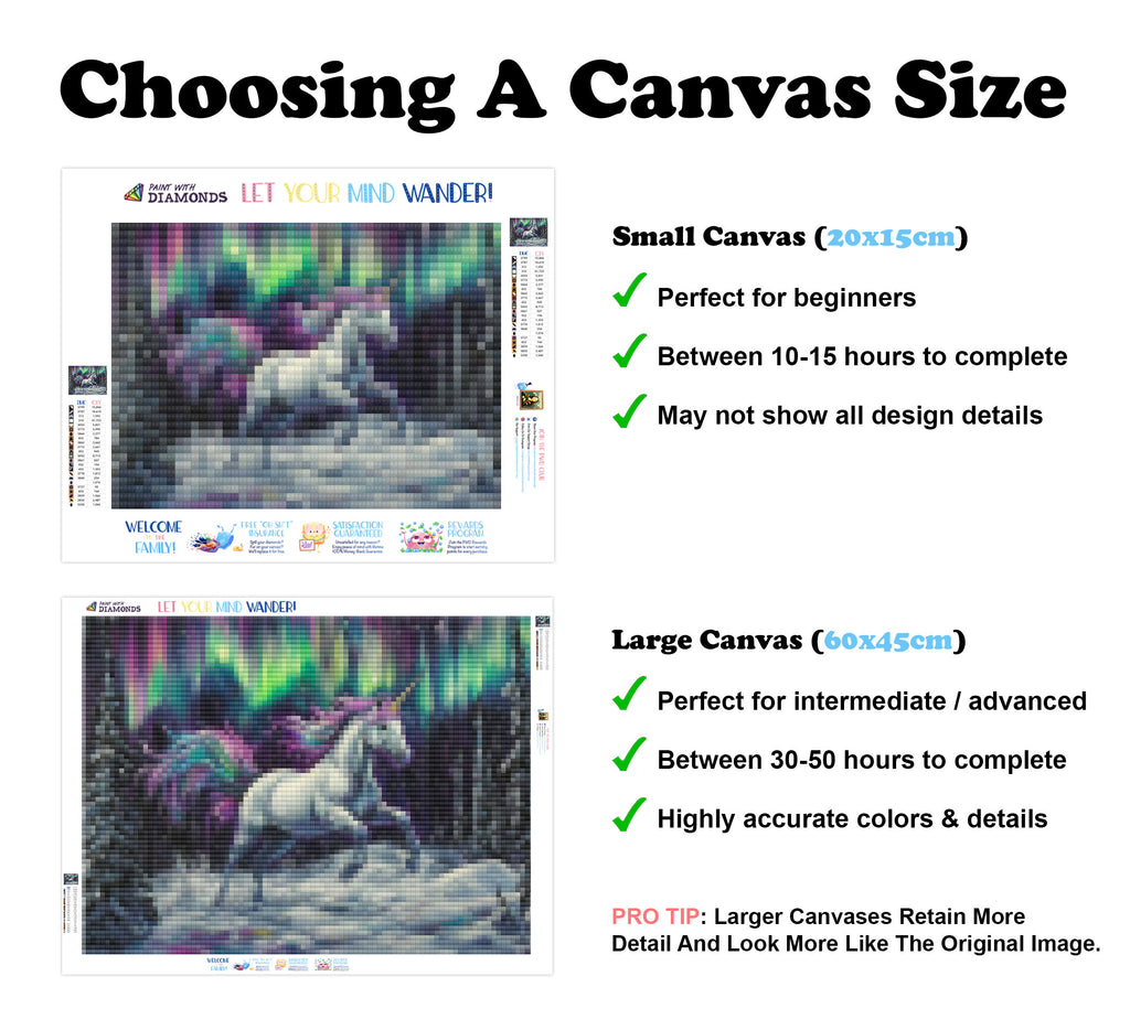 Large canvases show tiny details and all lettering, but may take up to 50+ hours to complete.