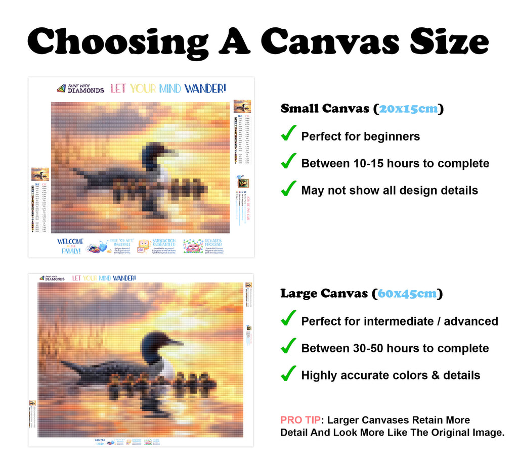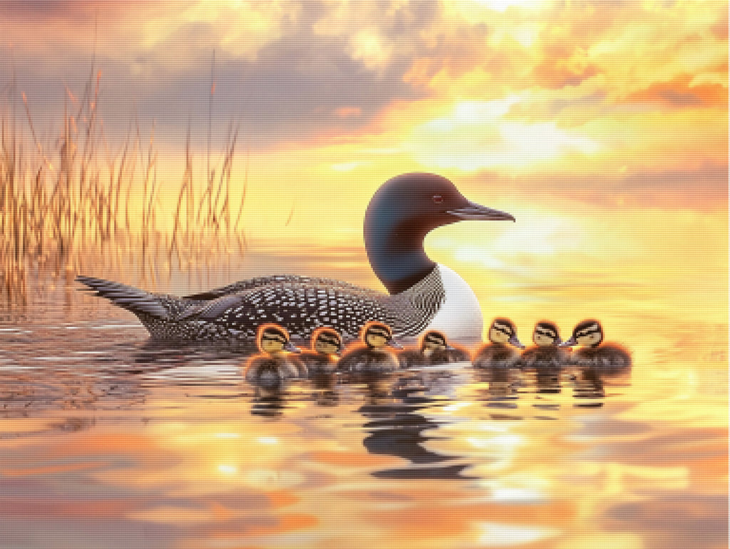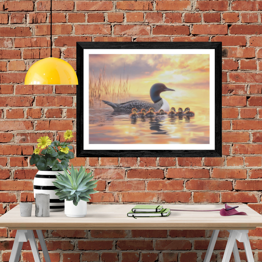 Escape into a world of vibrant colors and creative tranquility with the ‘Loon and Ducklings on a Sunset Lake’ Diamond Painting Kit. This exclusive full-drill design by artist Caleb Smith is available only at Paint With Diamonds. Let your mind unwind as you piece together shimmering diamonds to create a beautiful masterpiece.