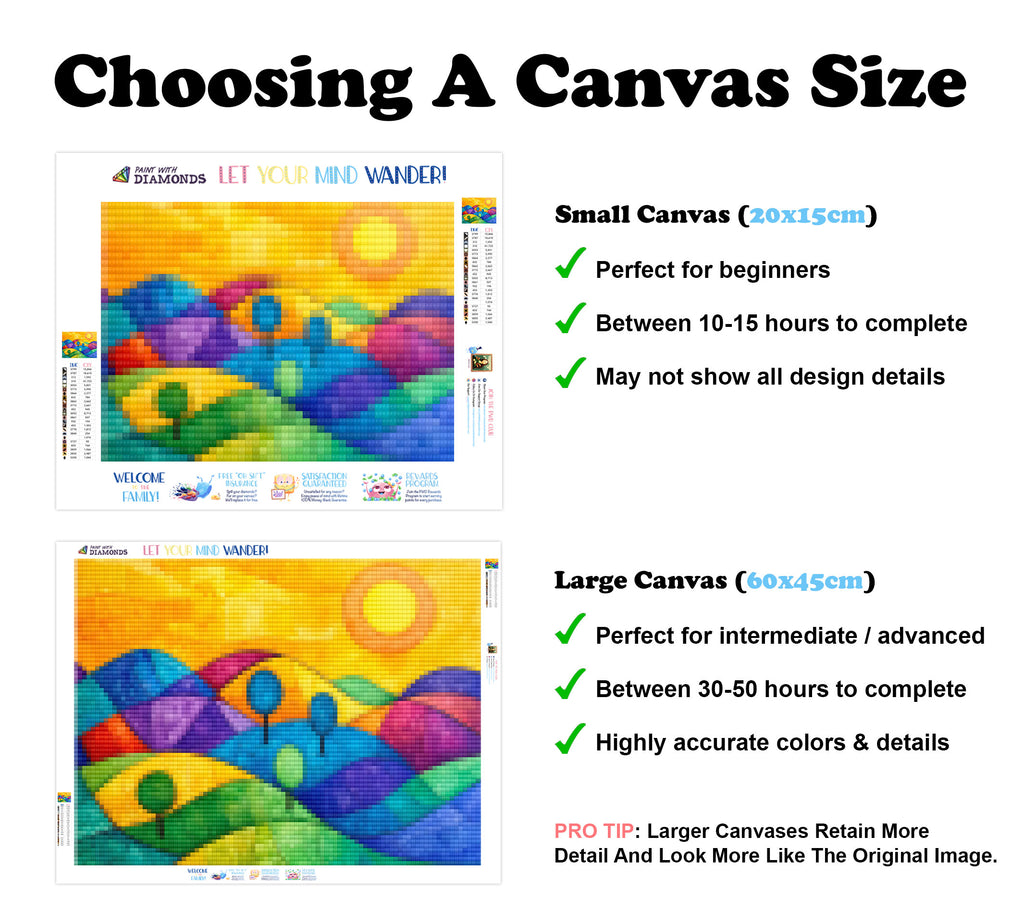 Premium Quality Diamond Painting Kit: Includes a velvety-soft adhesive canvas, eco-friendly shimmering resin diamonds, and a premium toolkit - everything you ned to get started on your next masterpiece.