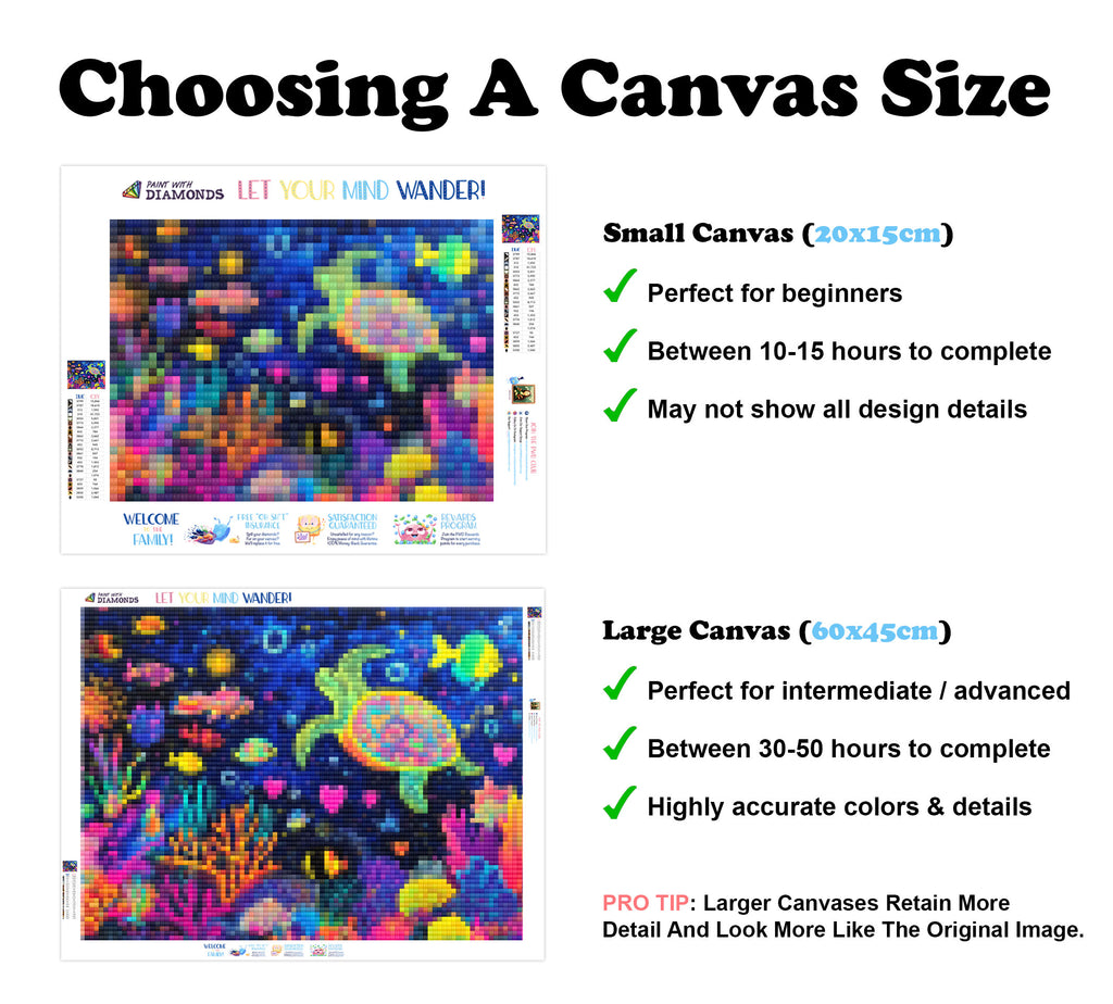 Large canvases show tiny details and all lettering, but may take up to 50+ hours to complete.