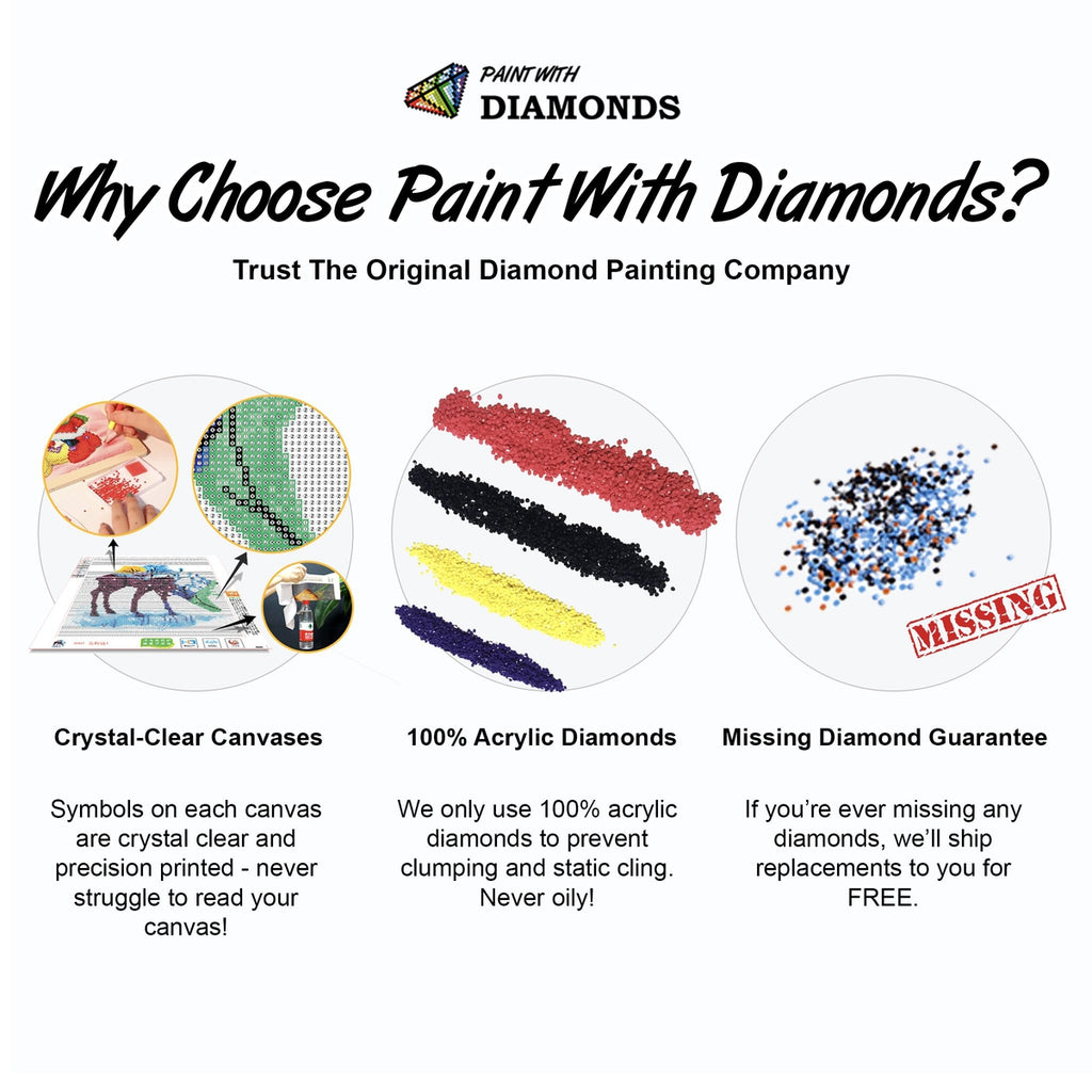 Paint With Diamonds® is a US-based company with over 500,000 customers and 10,000 5-Star reviews. We stand by our Diamond Painting Kits!