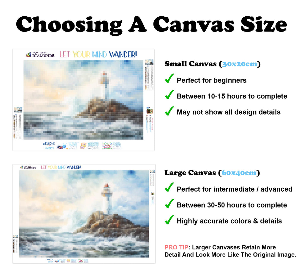 Large canvases show tiny details and all lettering, but may take up to 50+ hours to complete.