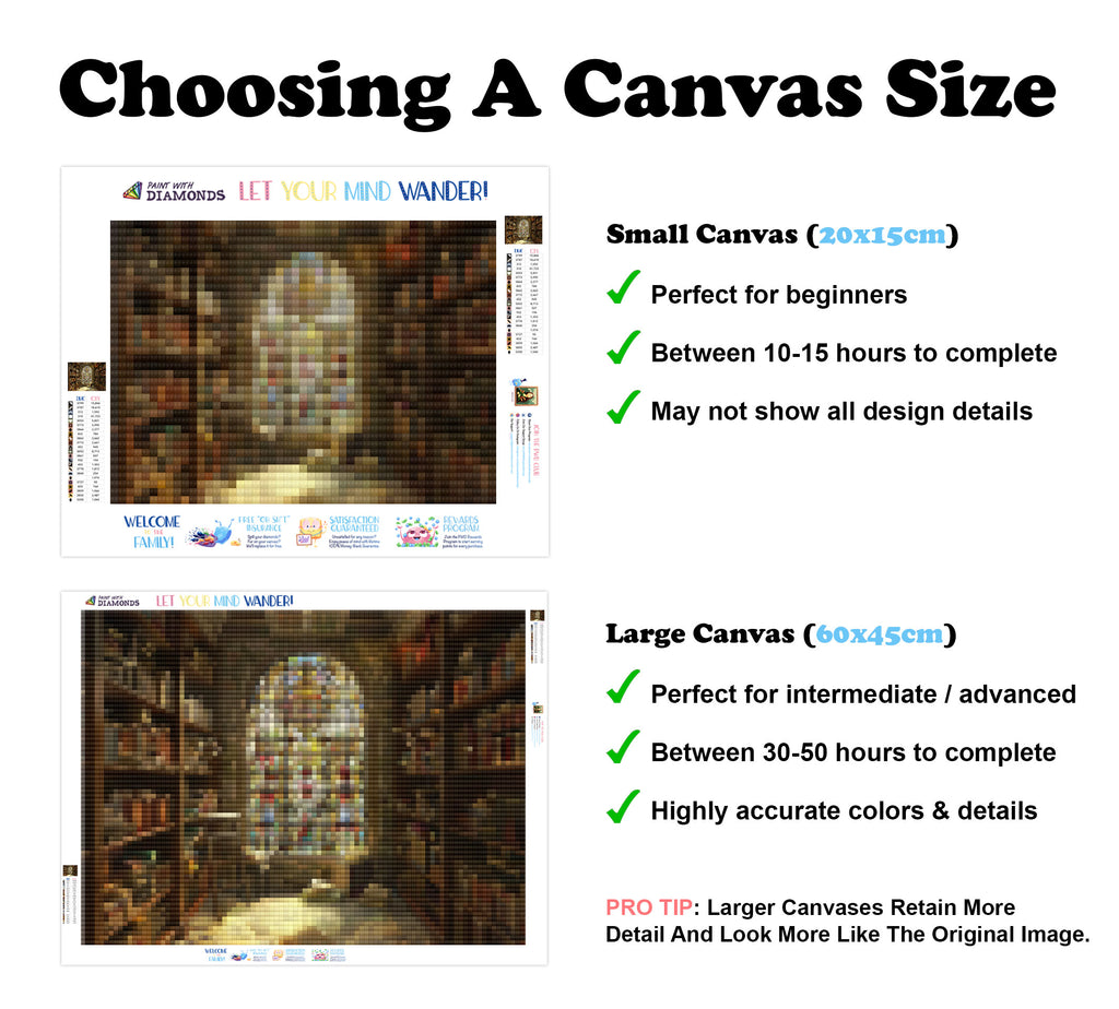 Large canvases show tiny details and all lettering, but may take up to 50+ hours to complete.