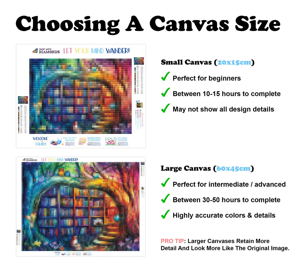 Large canvases show tiny details and all lettering, but may take up to 50+ hours to complete.