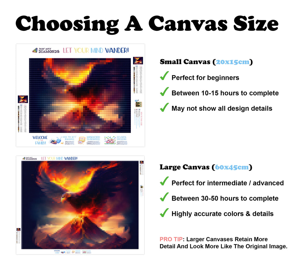 Large canvases show tiny details and all lettering, but may take up to 50+ hours to complete.