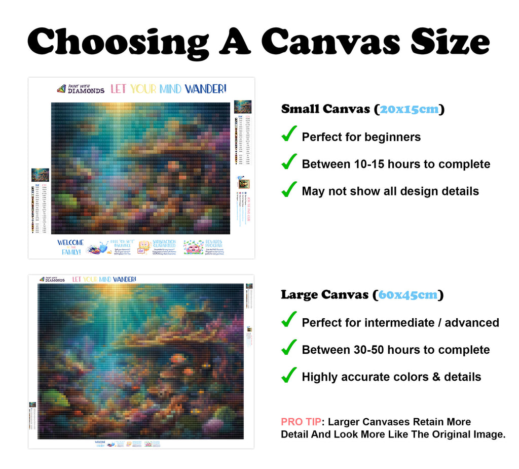 Large canvases show tiny details and all lettering, but may take up to 50+ hours to complete.