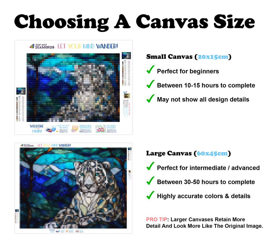 Large canvases show tiny details and all lettering, but may take up to 50+ hours to complete.