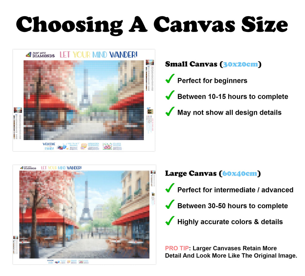 Large canvases show tiny details and all lettering, but may take up to 50+ hours to complete.