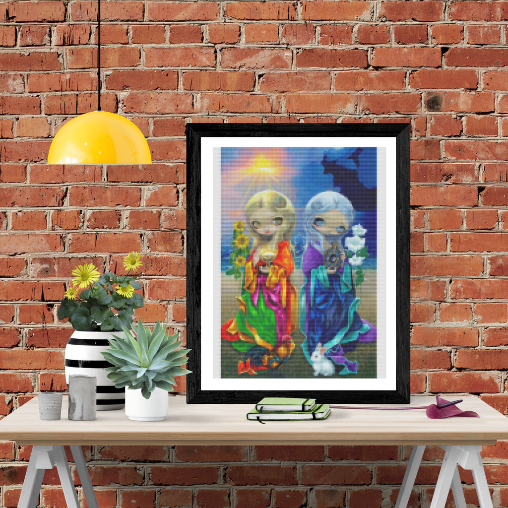 Escape into a world of vibrant colors and creative tranquility with the ‘Sun Child And Moon Child’ Diamond Painting Kit. This exclusive full-drill design by artist Jasmine Becket-Griffith is available only at Paint With Diamonds. Let your mind unwind as you piece together shimmering diamonds to create a beautiful masterpiece.